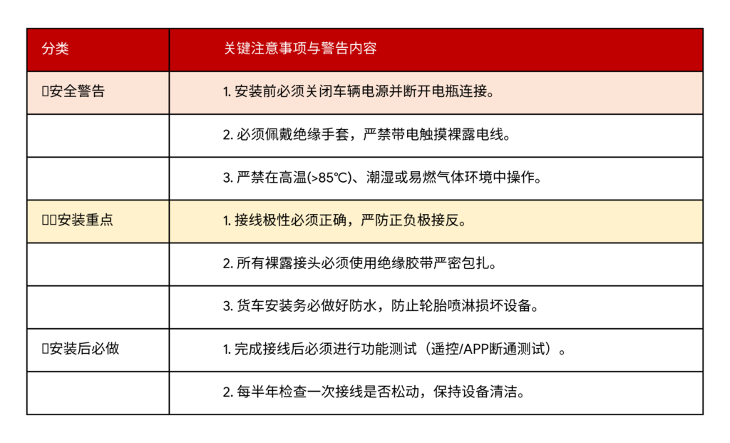 - 绝缘是重中之重:手册第 9 页特别强调,所有裸露接头必须包扎,防止行车颠簸中触碰车体金属。