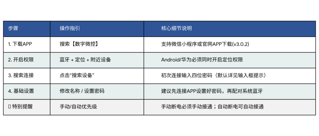 软件操作:配合【数字微控】v3.0.2 版本 APP 的连接步骤、界面分区说明及参数设置逻辑。